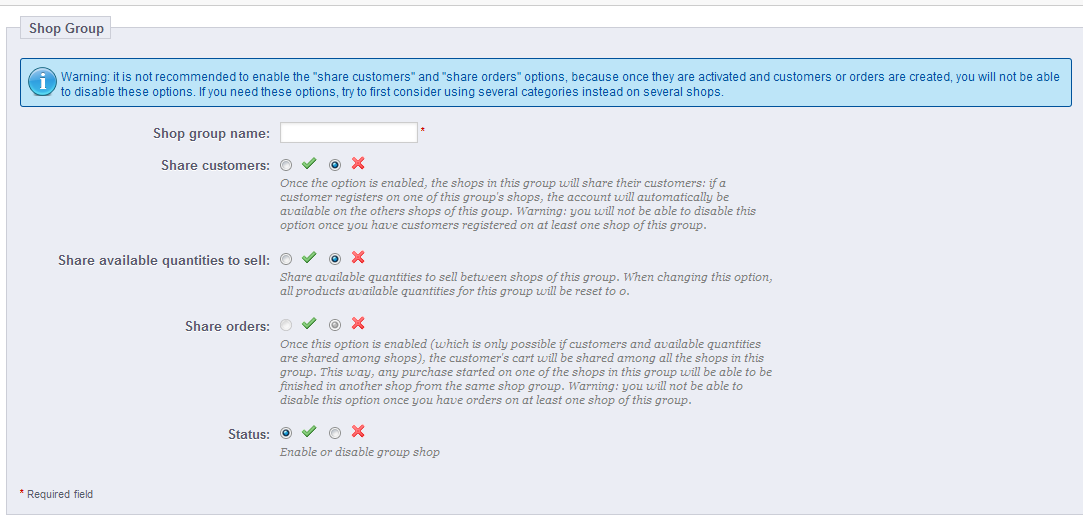 The main issue to remember about these settings is that you should do them BEFORE the stores are active and accepting orders. The warnings by PrestaShop all warn that once data is shared and flowing, you will not be able to turn off these options. Fill in the shop name and select the radial buttons for each of the next four options.