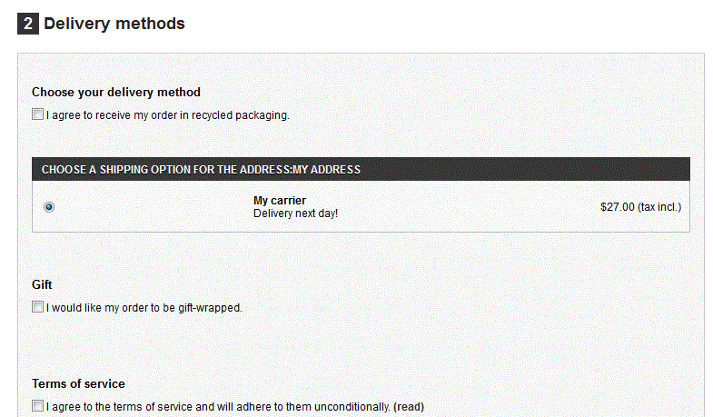 Some customers may want to ship a product immediately, so they opt for Next Day shipping. Next day shipping often appears to require shipping by plane, but depending on the zone that the customer orders from, they may be able to get it next day by truck. So, in this case, you may want set up a carrier that says NEXT DAY SHIPPING for "x" zone - where X is the region that the carrier will deliver next day by truck. The important factor in this example are the shipping and handling costs for AIR versus TRUCK. Shipping by air would certainly incur higher handling fees. Additionally, in some cases, they will not ship by air where it can be delivered by truck. This example is an extreme case to display an example where shipping and handling fees may NOT be included with a specific carrier because it's simply cheaper to ship through the carrier by ground (by truck). Depending on your profit margins, you may want to not include shipping and handling for this item. And this information isn't necessarily going to be shown to the customer as they will only see the discounted shipping price, because it was shipped by ground instead of by air. The screenshot below shows and example of where shipping delivery methods would appear for the customer purchasing from the store. Depending on what you provide for shipping options and their location, they may see one option or more: