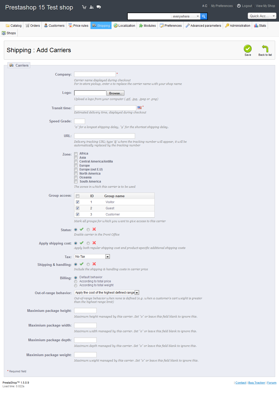The addition of a new shipping carrier requires a variety of information in order to be set correctly. To see more detail on all of the specific steps please refer to the following section on setting up the Carrier: Setting Up Shipping in PrestaShop 1.5