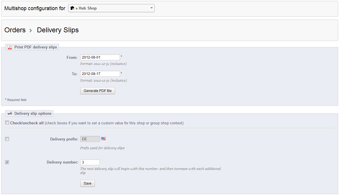 In order to provide a copy of the print list of the products being shipped, you can use the Delivery Slips option in the PrestaShop interface. This interface allows you to generate the PDF file of all orders within a specific date range. The following tutorial wills shows you how quickly create the PDF file for your delivery slips in PrestaShop 1.5.