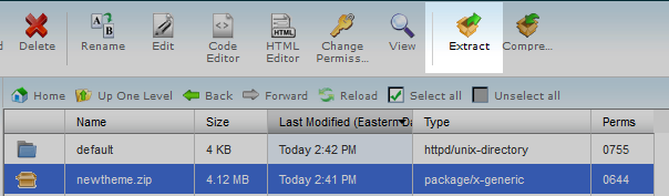 Once the zip file is uploaded, go back to your themes folder in the File Manager. You will see the file listed there. Highlight fie file by clicking on it, then click on the Extract option from the upper menu bar.