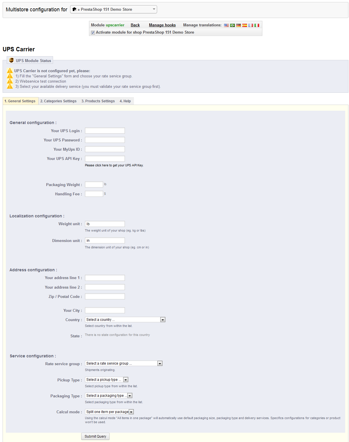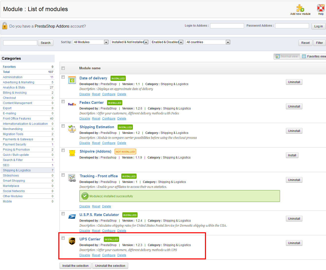 One of the most common concerns for users of a software like PrestaShop is the process of setting up shipping carriers. One of the most popular carriers is the United Parcel Service (UPS) which PrestaShop conveniently supports through a installable module. In order to find more information on installing modules go to How to Load New Modules in PrestaShop 1.5. The following article explains how to install and configure the UPS module in PrestaShop 1.5.