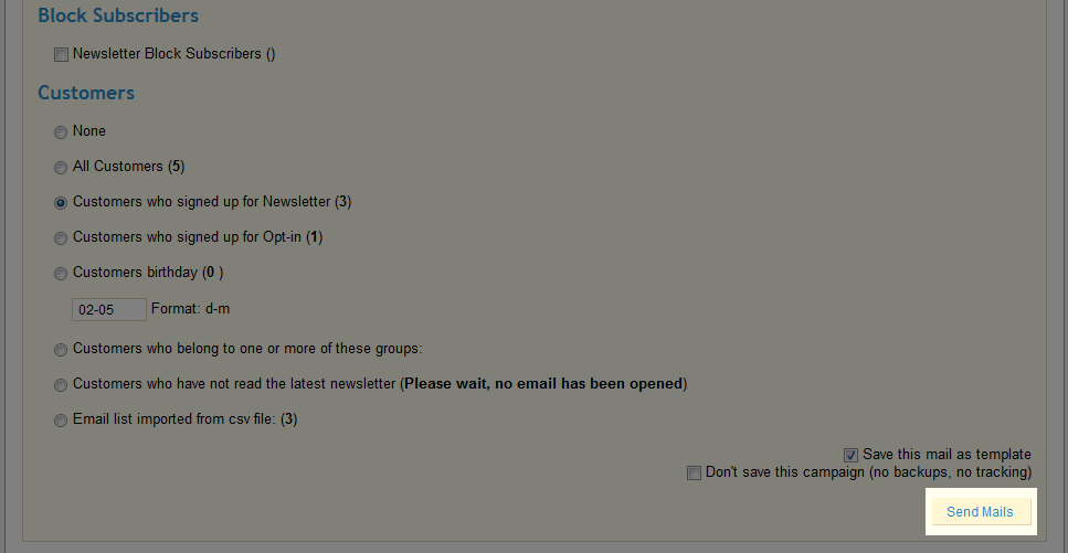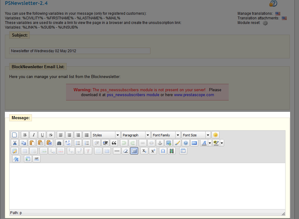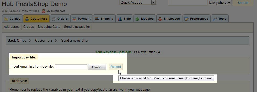 The Newsletter for PrestaShop module makes it possible for you to send newsletters to your customers from within your PrestaShop back office. With this module, you will not need to use a separate newsletter program. Once you have installed the Newsletter for PrestaShop module, you're ready to send your first Newsletter.