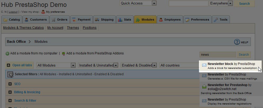 The default installation of PrestaShop comes with a module you can install to assist you in adding subscribers to your newsletter mailing list. The Newsletter block module adds fields to your PrestaShop site and your new user registration page where visitors and new site users can sign up to receive your newsletter. Installing this module is a quick and easy process.