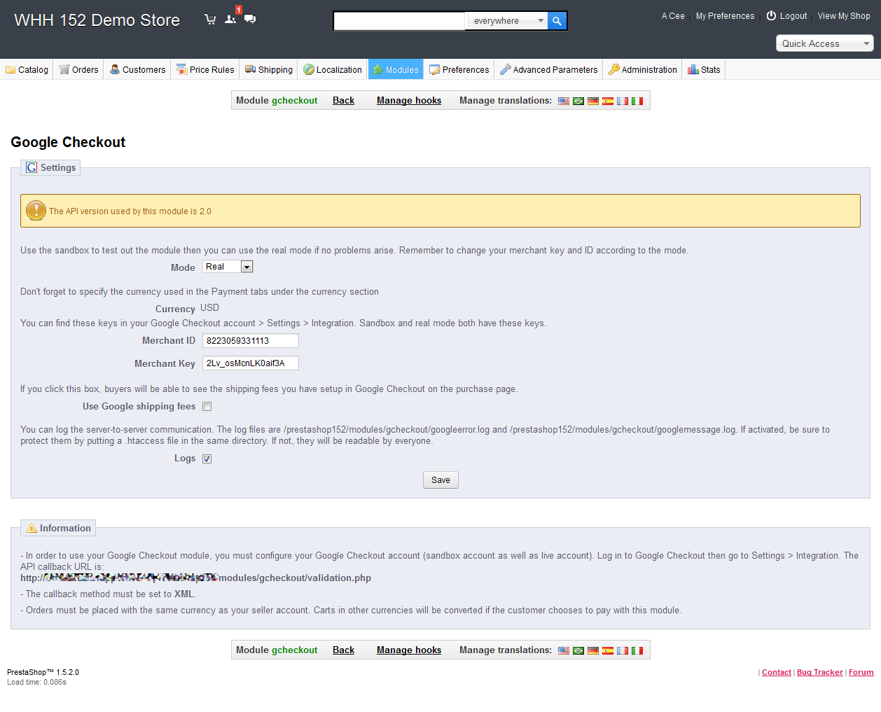One of the many options that you will need to setup for an ecommerce store is a payment gateway. One of the more popular ones that you can obtain for PrestaShop is Google Checkout. By default, this module is not installed. The following tutorial shows you how to install and configure the Google Checkout module in PrestaShop 1.5.