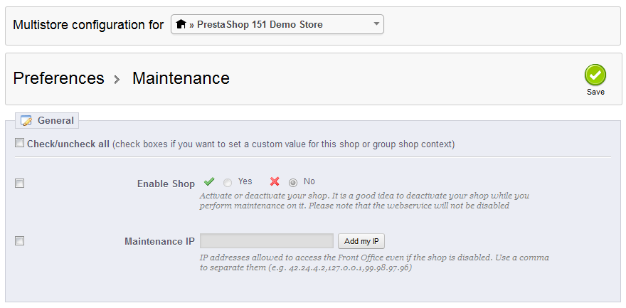 A commonly asked question is, "How do I keep my customer from seeing my site while I work on it?" The answer is to use a feature that is often called the "maintenance mode". This option is quite often a plugin or extension, but in Prestashop, the programmers have kindly added it as a built-in feature. Be sure that you have updated PrestaShop to the latest version as this procedure will vary between the current release and past versions. Maintenance mode allows you to keep the shop from being accessed by the general public, while allowing you to specify access to who you desire.