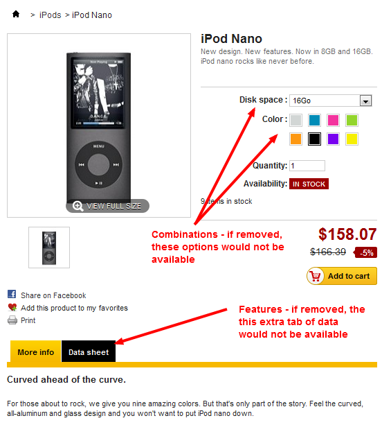 Disabling the optional features is one of the steps you can take to optimize the performance of your shop. You should only do this if you are encountering performance issues and if your product descriptions are sufficient to make for the loss of information that removing these features will cause. Of course, this also depends on your inventory and if they were using the features in the first place. Here's an example of how it would look to the customer to remove the features (the combinations and features are noted):