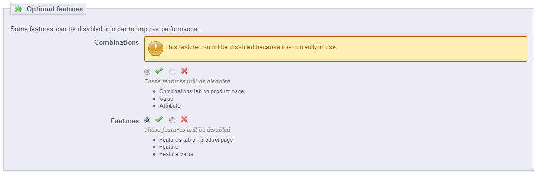 - Combinations - Note that this feature will be grayed-out due to the fact that it may be currently in use with one or more of your products. In order to change this option, you will need to remove these features from all inventory. Once none of your products are using it, then you will be able to disable the features by clicking on the 'X' radial button.