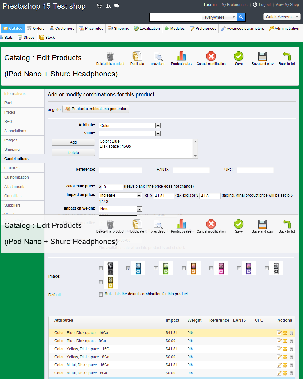 Product combinations often occur when there are variety of attributes that may distinguish the product when it is purchased in quantity. For example, if your product comes in different colors. Some customers may want to purchase the product in different colors. The issue is more of an issue when there may be differences weight thereby affecting shipping weight and cost. This information can be accounted for in the COMBINATIONS tab for a product. The following tutorial will show how to use COMBINATIONS in PrestaShop 1.5.