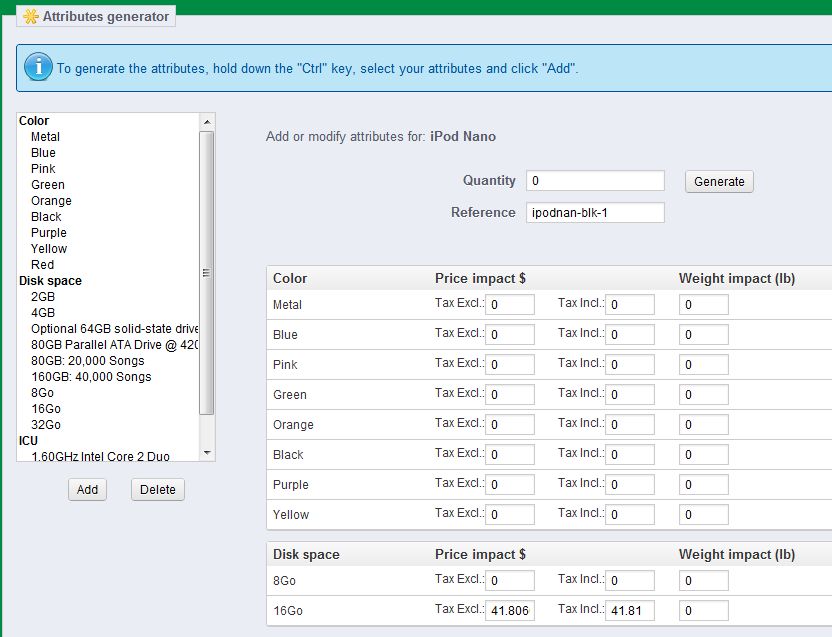 As the manual way of creating these combinations (Using the method described in Using Combinations for Products in PrestaShop 1.5). The automatic version generates the screenshot above, but the actual impact on the customer will be only through price and shipping costs that they see during checkout of their product.