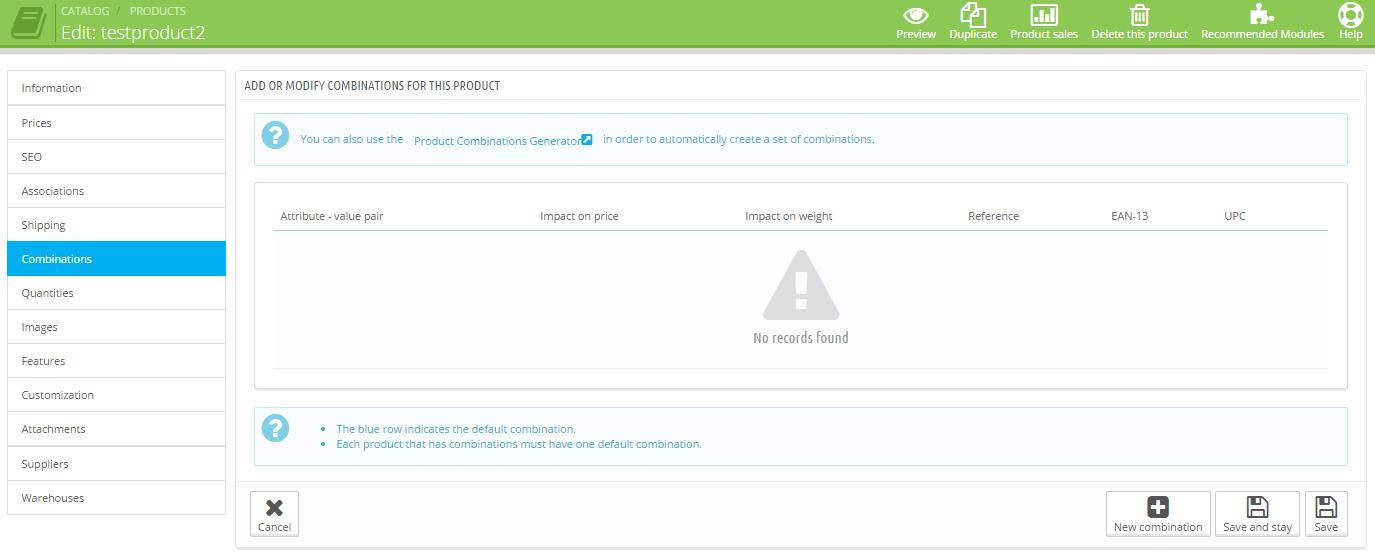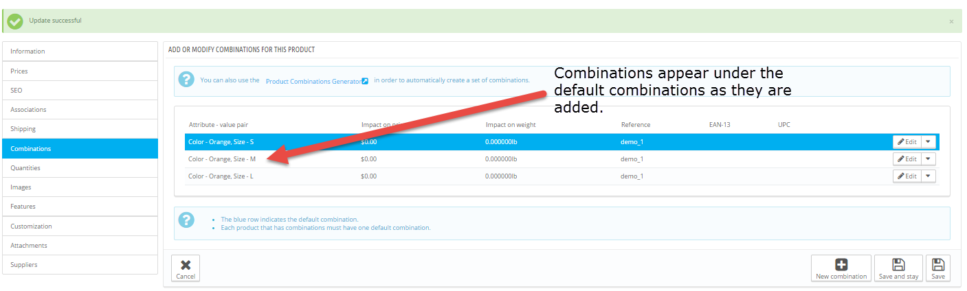 The following tutorial steps through manually creating product combinations with the PrestaShop 1.6 interface.