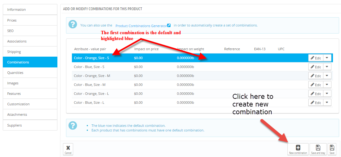 The blue highlighted row is the default combination for the product. To edit an existing combination, click on the Edit button at the far right. Note that all products have at least one default combination.