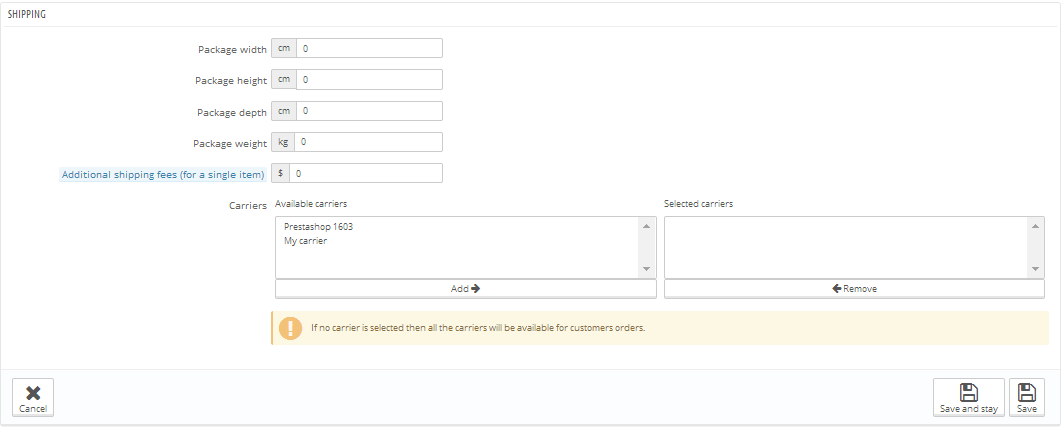 The Carriers tab is divided into two sections: Available carriers and Selected carriers. In order to add a carrier that will be used to ship your product, first click on a carrier in the Available carriers list. Then click on the button labeled Add. This will add the carrier to the Selected carriers list. Click on Remove in order to remove a selected carrier.