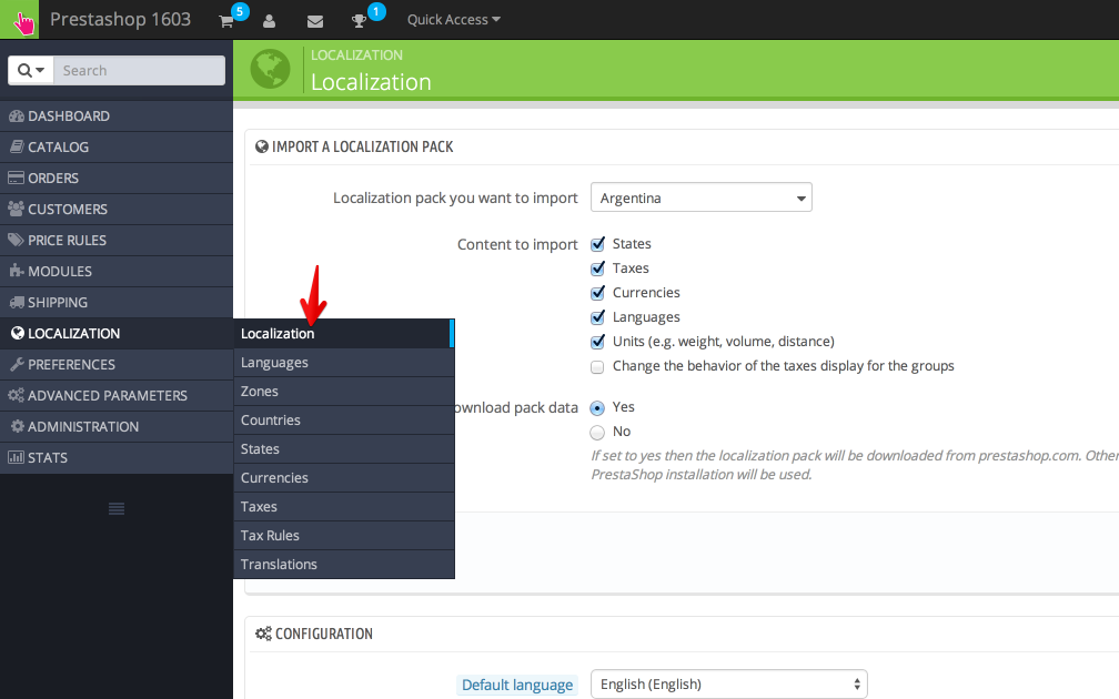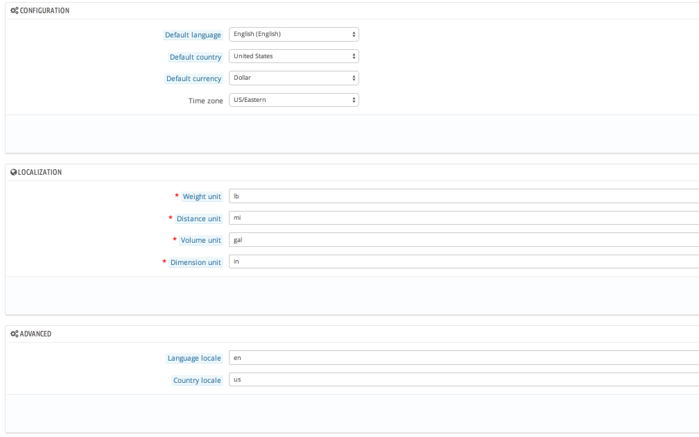 Language, country, currency and timezone are loaded using the Localization feature of the PrestaShop 1.6 administrator dashboard. The following tutorial will show you how to set these important values. Be careful with this setting as it does affect all application text within your shop and the administrator dashboard.
