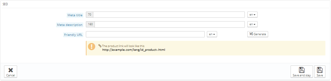 If you need a little help, use the Generate button in order to create a friendly URL based on the product name. You can always edit the URL after it has been generated. When the URL is complete, you will see the complete URL in the yellow block immediately below the Friendly URL line.