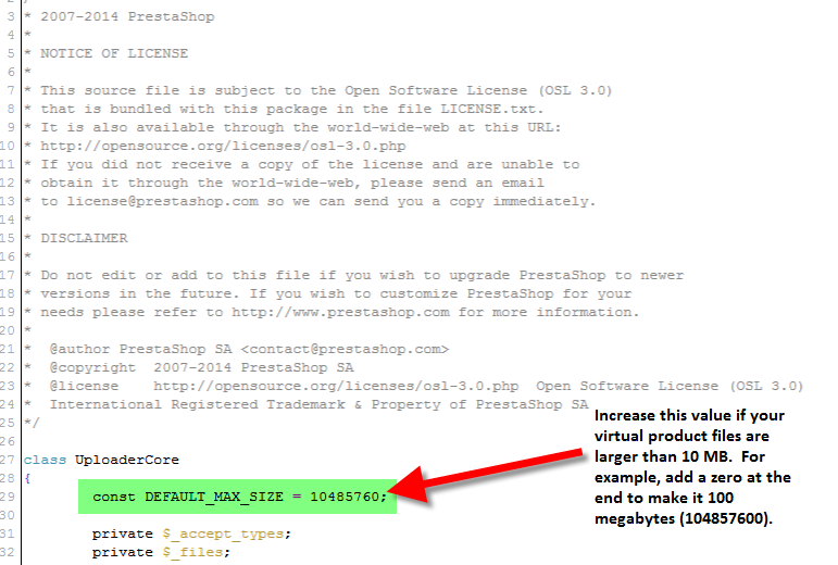 PrestaShop 1.6 allows you to add virtual products that have associated downloadable files in your catalog of products. These files may vary in size, but by default PrestaShop limits the size of the file to 10 MB. The 10 megabyte limit can be found in the UPLOADER.PHP file of your PrestaShop installation. If your file is larger than 10 MB, then you will need to increase the virtual product upload limit.