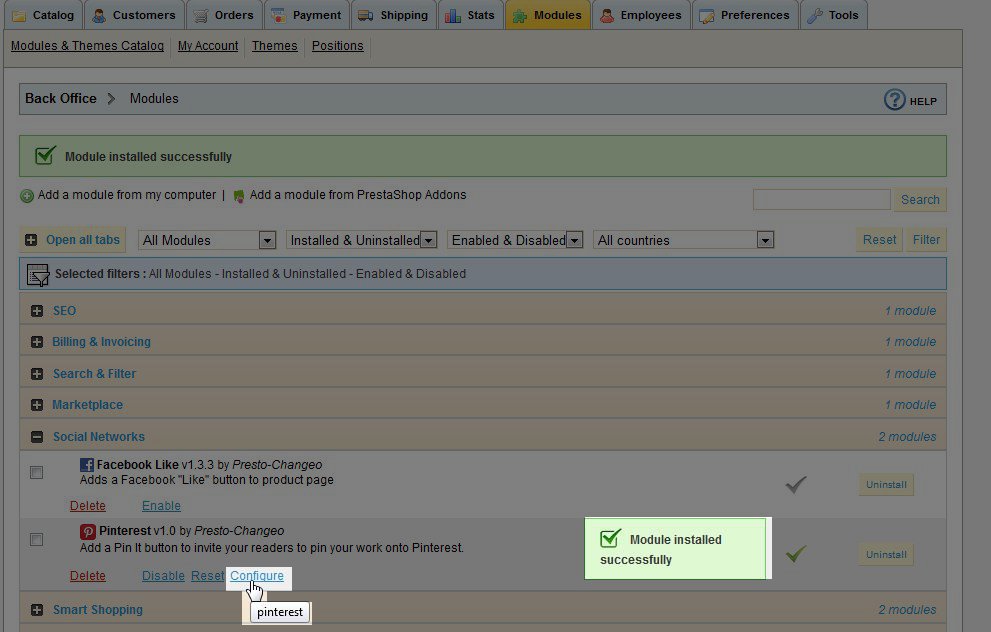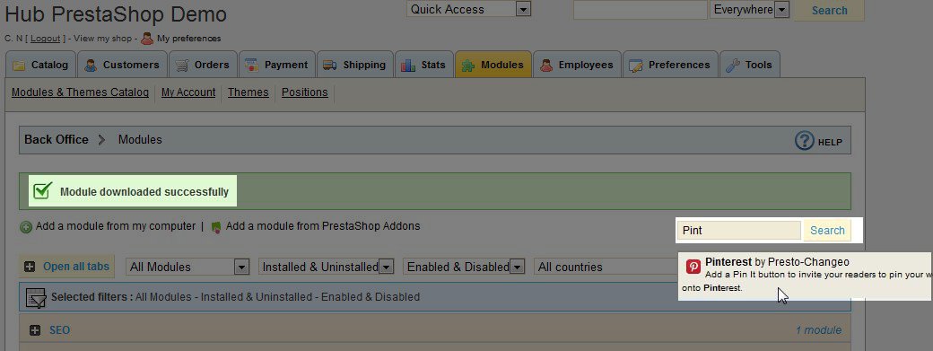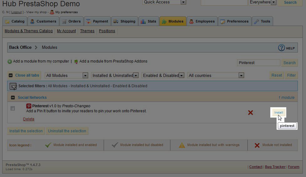 There are several modules already available for adding a Pinterest Pin It button. In this tutorial, we will walk through installing and configuring the free Pinterest module from PrestoChangeo. Once you have downloaded this free module from their site, you are ready to install the module and set up your Pinterest Pin It button.
