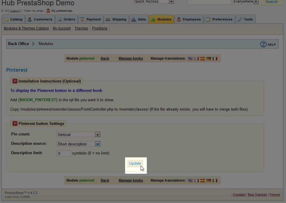 Pinterest is currently the third most popular social network in the world. With the exponential growth in users, this is a social network that can help bring in traffic for your PrestaShop store. Pinterest users create virtual boards and then pin items they like to those boards. You can make the pinning process easy for your site visitors by adding a Pin It button on your product pages. This could potentially increase the number of pins your products receive.