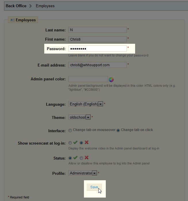 You can easily change your PrestaShop admin password from within the PrestaShop back office. This is useful if you would like to rotate passwords for security reasons or think that your password may have been compromised. It's also helpful for changing your password to a preferred password after a password reset using the Lost password link on the PrestaShop log in page.