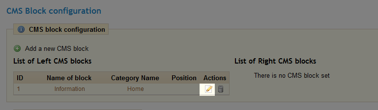 - On the CMS block configuration page, select the edit icon for the Information block.