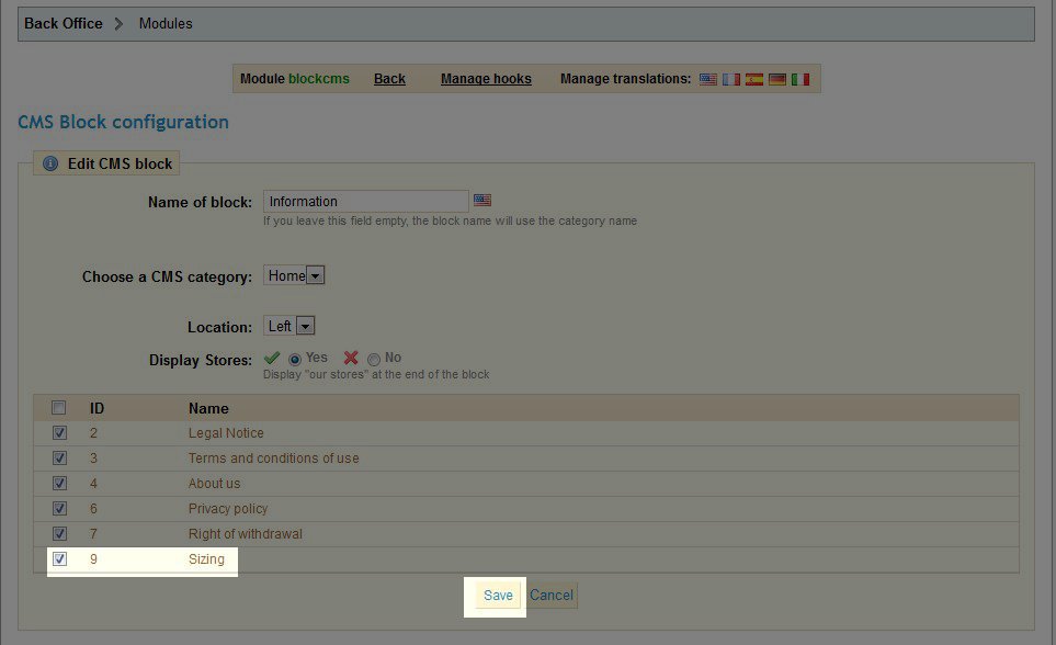 - Select the box next to your new page to enable it in the Information block and click the Save button.