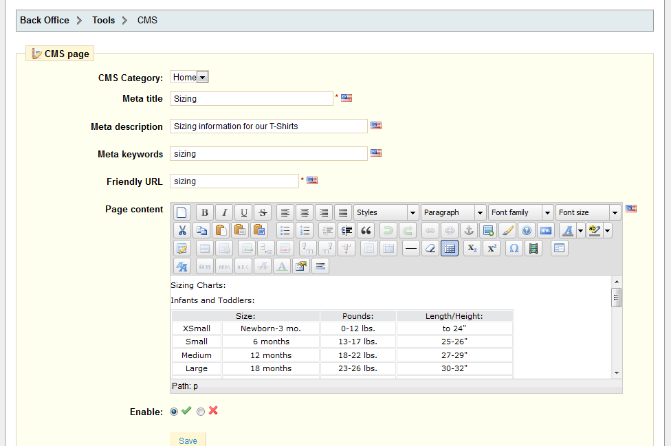 Enter in the content for your page. You can use the built-in text editor in PrestaShop to style and arrange the text in your information page. |