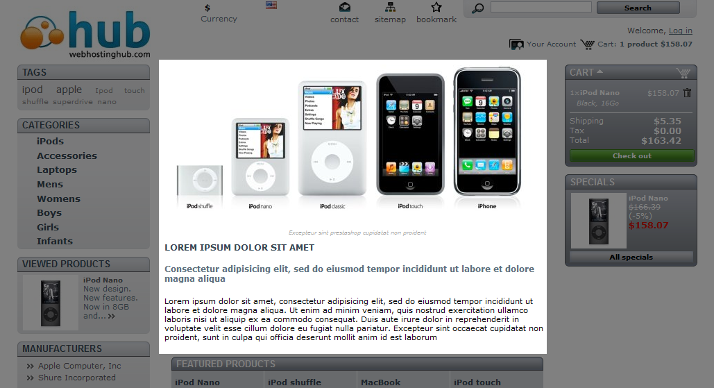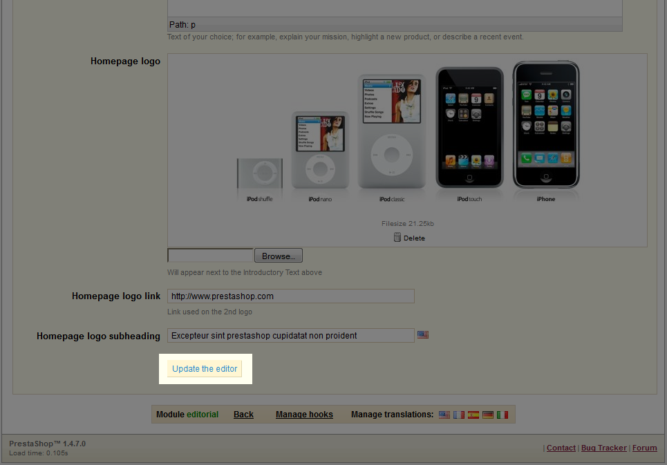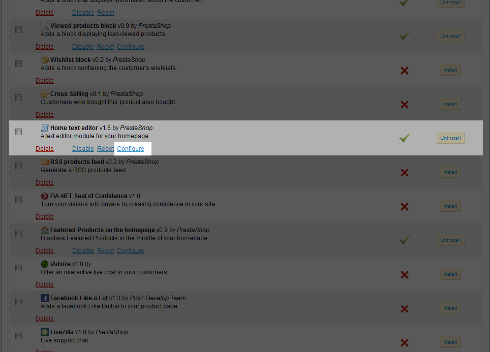 The PrestaShop Home text editor module allows you to create and edit text for your PrestaShop home page. If you selected the full installation of PrestaShop, this module should already be installed and enabled for your store. The default installation of this module is populated with what is known as "dummy text" and a filler image until you update the content.