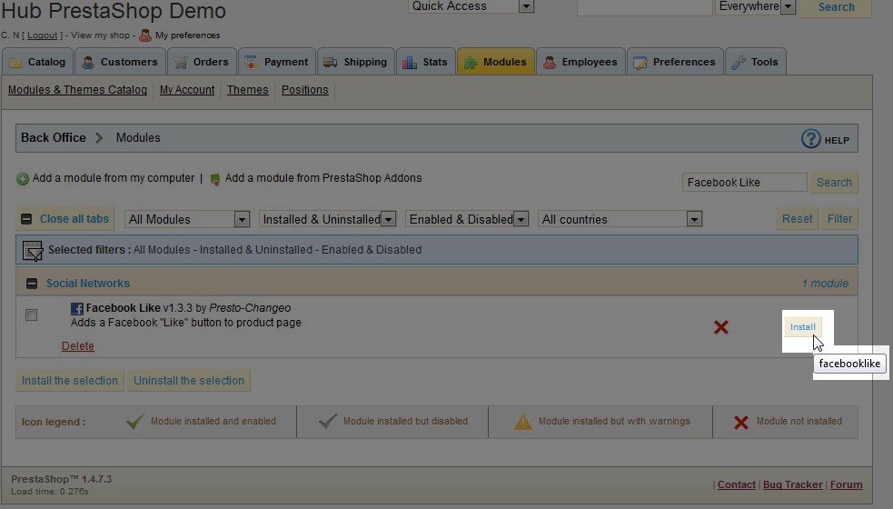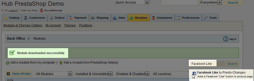 Adding a Facebook Like button in PrestaShop is easy to do by installing a module in PrestaShop. There are quite a few modules for adding a Facebook Like button, both free and premium. In this article, we walk you through installing and configuring the free Facebook Like Button module from PrestoChangeo. Once you have downloaded this free module from their site, you are ready to install the module and set up your Facebook Like button.