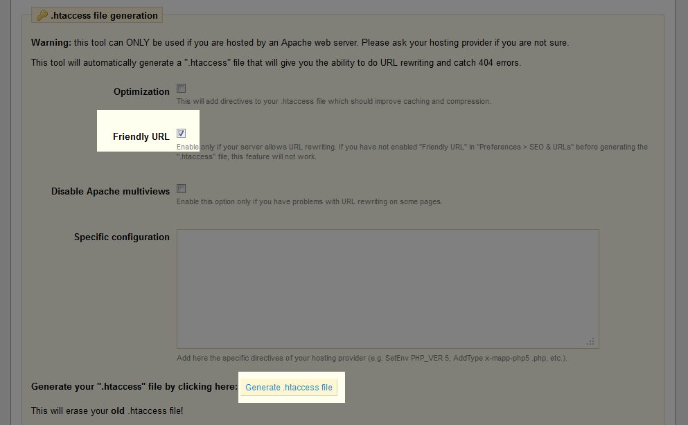 This is only the first part of the process, now we will need to regenerate our .htaccess file to start using SEF URLs in our PrestaShop installation.