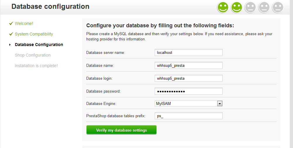 - Click the Verify my database settings button to confirm PrestaShop can connect to your database.