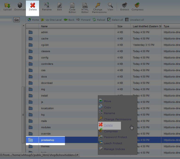 - Once all the files are moved, you can delete the prestashop directory. Either select the directory and then click Delete in the File Manager menu or right click the file and select Delete.
