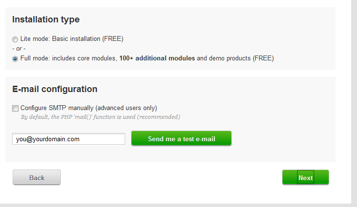You can choose between a basic installation or full installation. The basic installation will not include any modules, theme, or demo products and categories. The full installation installs core modules, additional modules, demo products, and will include a theme. For this example I will choose the full installation. This will give us a good starting point to really see what PrestaShop will look like to our visitors. We can always disable modules we don't need and remove the test products and categories as well.