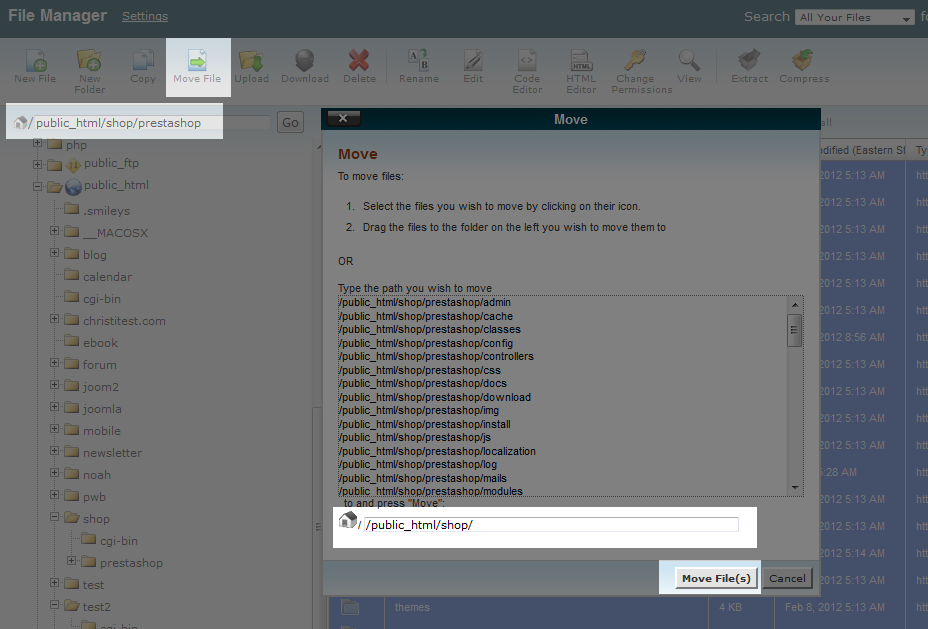 - Because this creates an extra subdirectory named prestashop, we will want to move all of the files and folders inside of that folder up one level to the correct directory. Navigate into the prestashop folder, select all of the files, then click Move File from the File Manger menu (you can also right click over any of the highlighted files and select Move). When the move dialog appears, delete "prestashop" so that your files will be moved up one level into the correct directory.