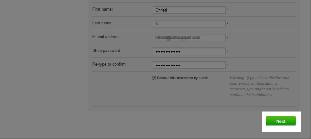 - Once you've filled in your information and uploaded your shop's logo, check the box to receive the information via email, and click the Next button to continue.