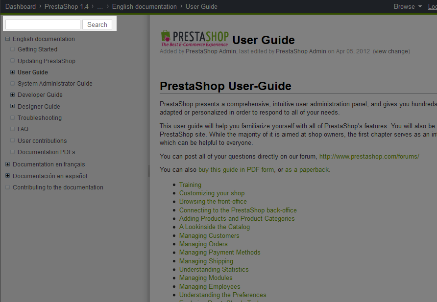 PrestaShop provides free online manuals for Users, Systems Administrators, Developers, and Designers. New users will want to start off with the User Guide. Once working with PrestaShop becomes a little more familiar, your can review the other guides as well to increase your PrestaShop knowledge. If you are looking for specific information in a PrestaShop guide, a search feature is included which makes it easier to find that information.