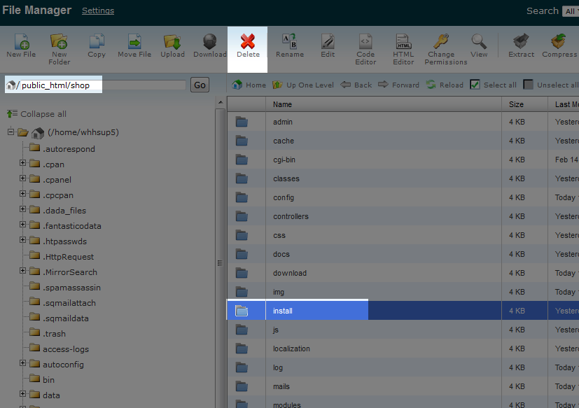When you get to the last page in the installation process, along with the installation complete message, you'll notice an notification to delete the install folder. We can easily do this through File Manager in cPanel. Select the install folder and either click on the Delete icon in the File Manager menu or right click the folder and select Delete from the menu that appears.