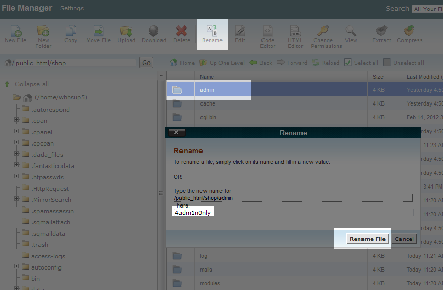 Another recommended step to improve security for PrestaShop is to rename your admin folder. By renaming your admin folder something unique (but something you can remember) you can help deter hack attempts that try using standard folder names like "admin" (e.g. brute force attacks). You can easily rename the admin folder by also using the cPanel File Manager. Select the admin folder and click on the Rename icon in the File Manager menu (you can also right click and choose Rename). Pick a unique name and use a mix of letters and numbers, but do not use special characters such as $, %, *, etc. For example you could name your folder 4adm1n0nly. Please note, as this example is given a public venue, you will want to choose a different name for your admin folder: