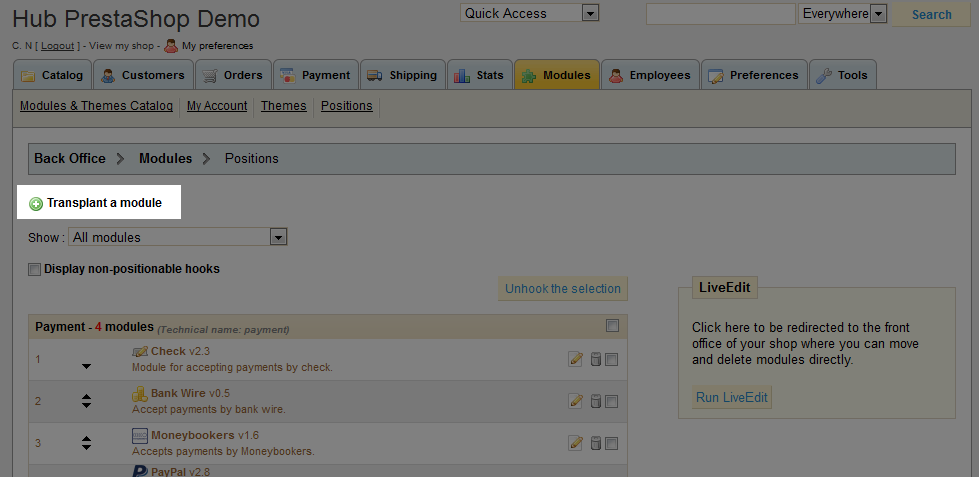 That's all it takes to unhook or move modules in PrestaShop. The LiveEdit feature in PrestaShop offers a WYSYWIG (what you see is what you get) interface for removing and moving modules in most of the PrestaShop hooks as well. Our next tutorial walks you through using the LiveEdit feature in PrestaShop.