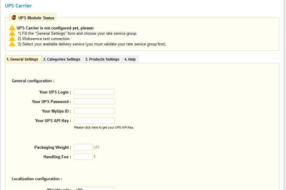 Prestashop shows me the warning: "UPS Carrier - 'Packaging weight' , 'Handling fee' must be configured to use this module correctly. " What are this fields exactly for? Thanks in advance. Best regards. |