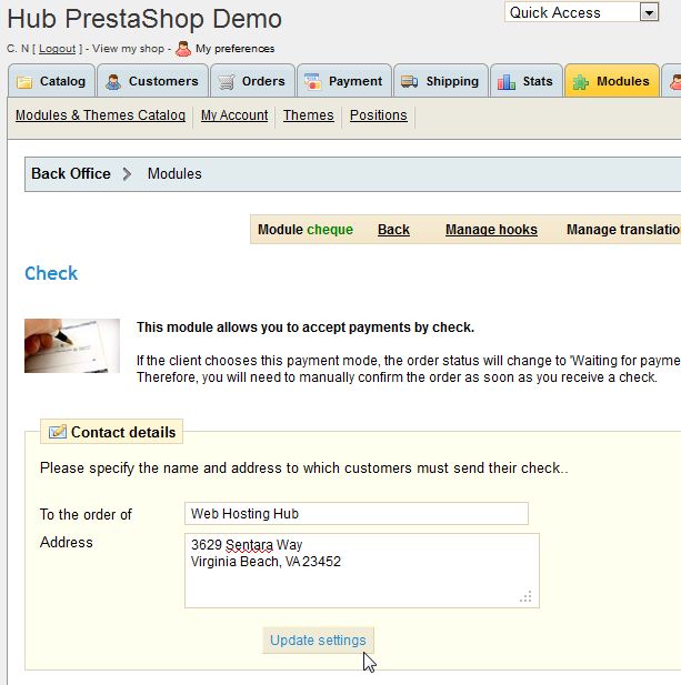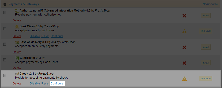 One of the many methods available for payments in a PrestaShop store is accepting payments made by check. It's up to you as a store owner to decide if this is a payment method you wish to use. While checks are not nearly as popular today as online payment methods, some PrestaShop website owners may wish to allow customers the option to pay by check. Fortunately, this is a module that is installed by default if you opted for the full installation during the PrestaShop install process. All you will need to do is configure some settings for the Check payment module.
