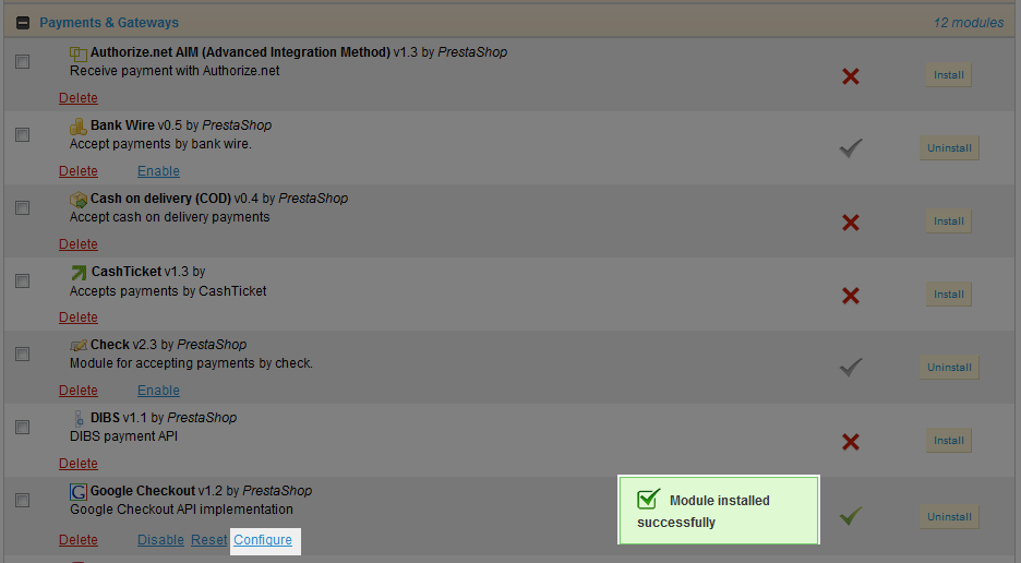 - Once you see the notification that the module installed successfully, click on the Configure link for the Google Checkout module.