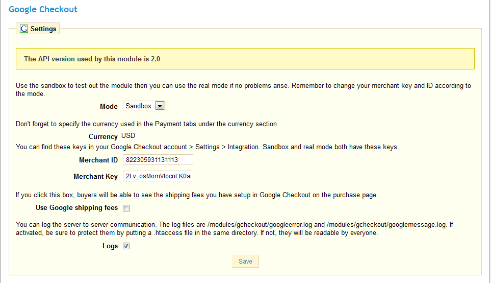- In the fields provided, input your Merchant ID and Merchant Key for your Google Checkout account.
