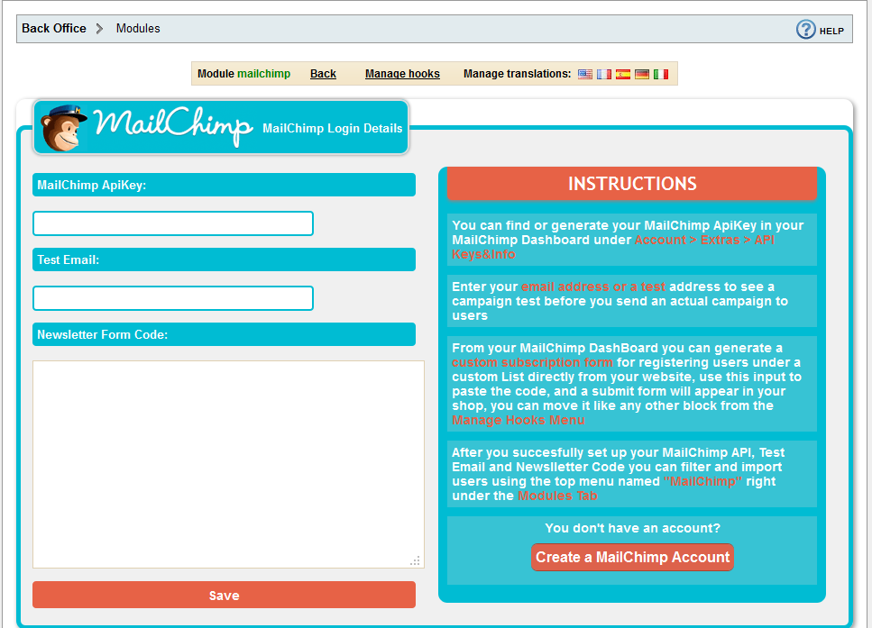 Please note, if you do not already have a MailChimp account, you will need to sign up for one before installing the MailChimp for PrestaShop module.