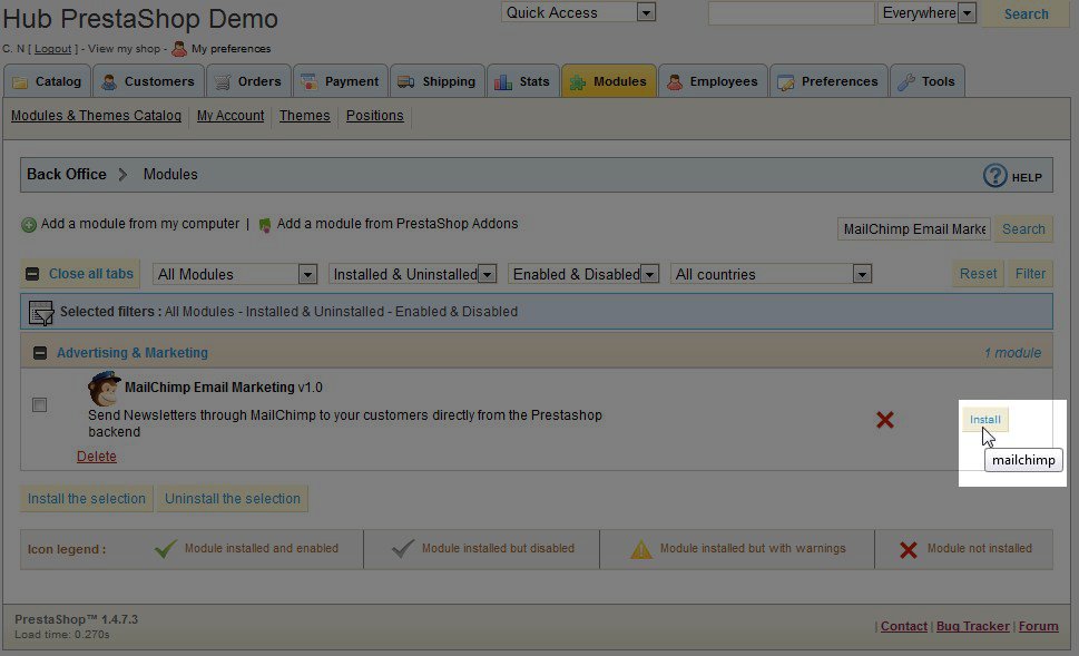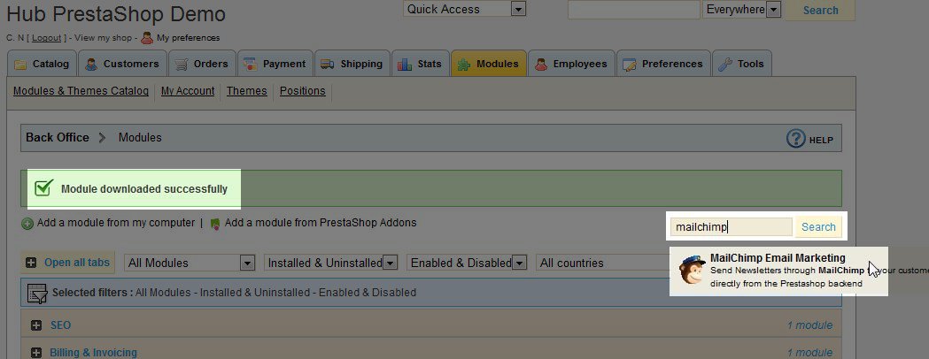 The MailChimp module is a free newsletter module that makes it possible to link your MailChimp account with your PrestaShop site. Before you can begin using this module in PrestaShop, you will first need to install it in PrestaShop and then configure the module's settings to work with your MailChimp account. In this tutorial, we will walk you through the steps of installing the module in PrestaShop. In our next tutorial, we will continue with the configuration of the module.