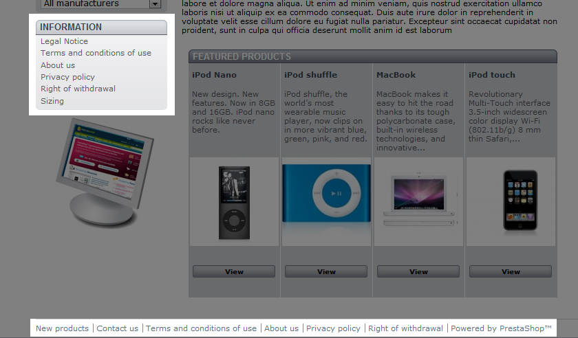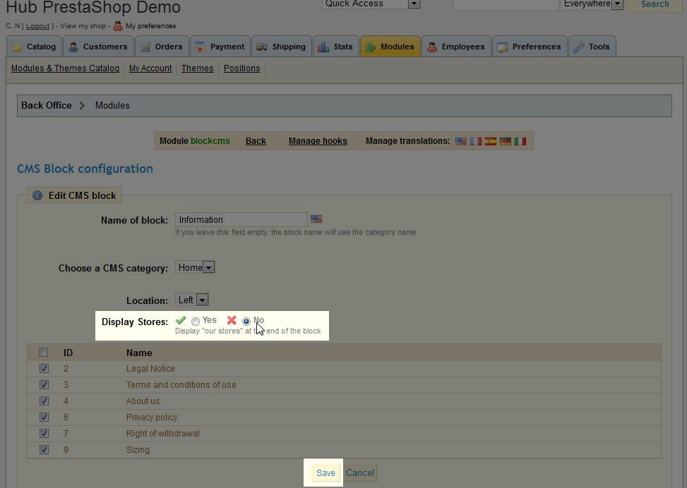 We still have one other area to edit to remove the Our Stores links shown in the Information block and the footer of our PrestaShop site.