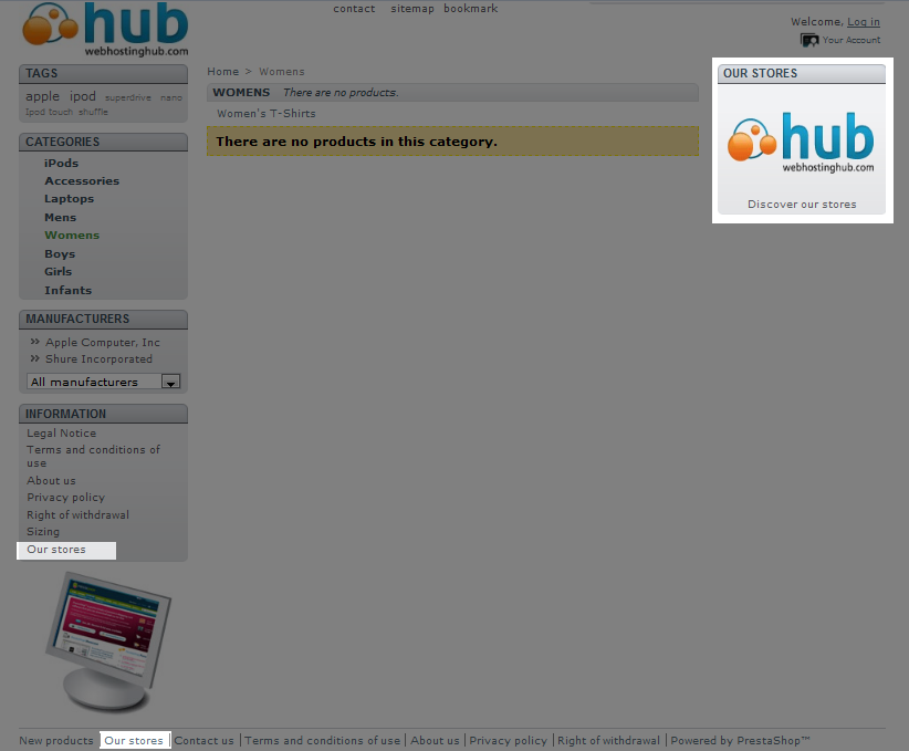 Now when you view your PrestaShop store, you will see that the Our Stores block has been removed from the right side of the site.