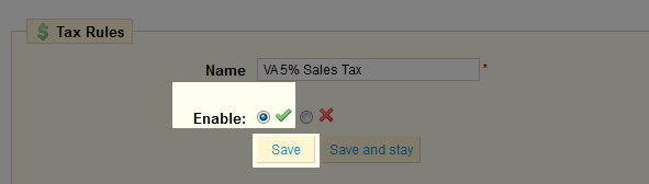 - Select the radio button next to the check mark to Enable your new tax rule and click the Save button.