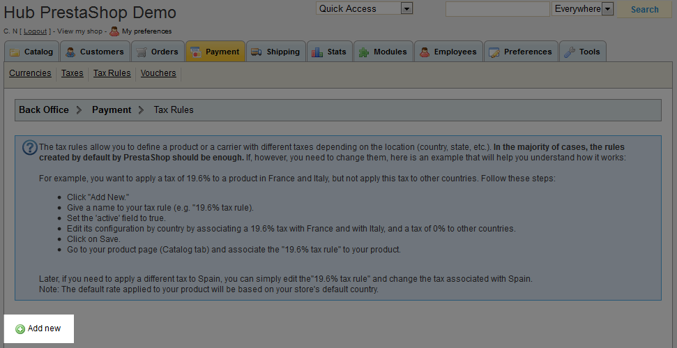 - To begin creating your new tax rule, click on the Add new link.