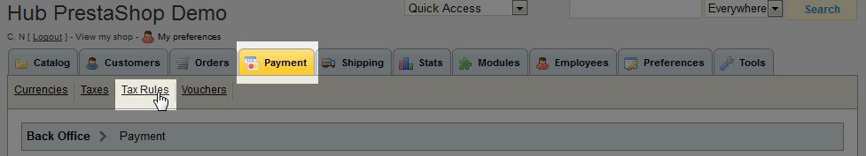 - Click on the Payment tab and then the Tax Rules link.