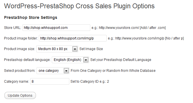 | Select product from | Whole database will show a random selection from all of your PrestaShop products. One category will display an additional field where you can input the ID of the category you want to display products from. |